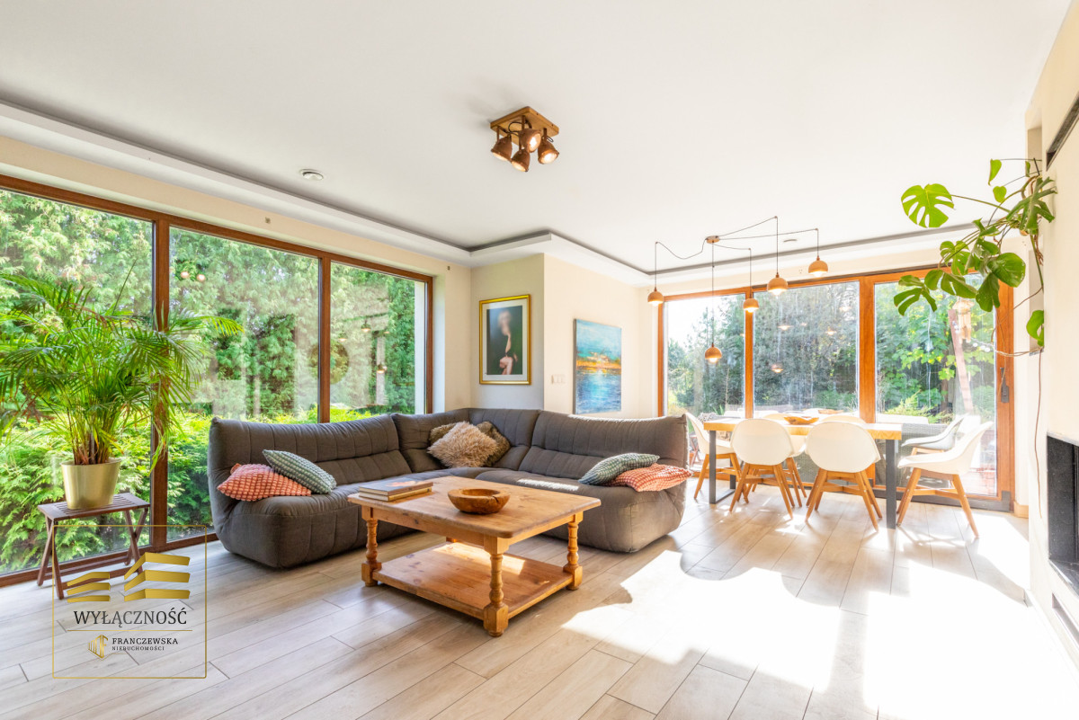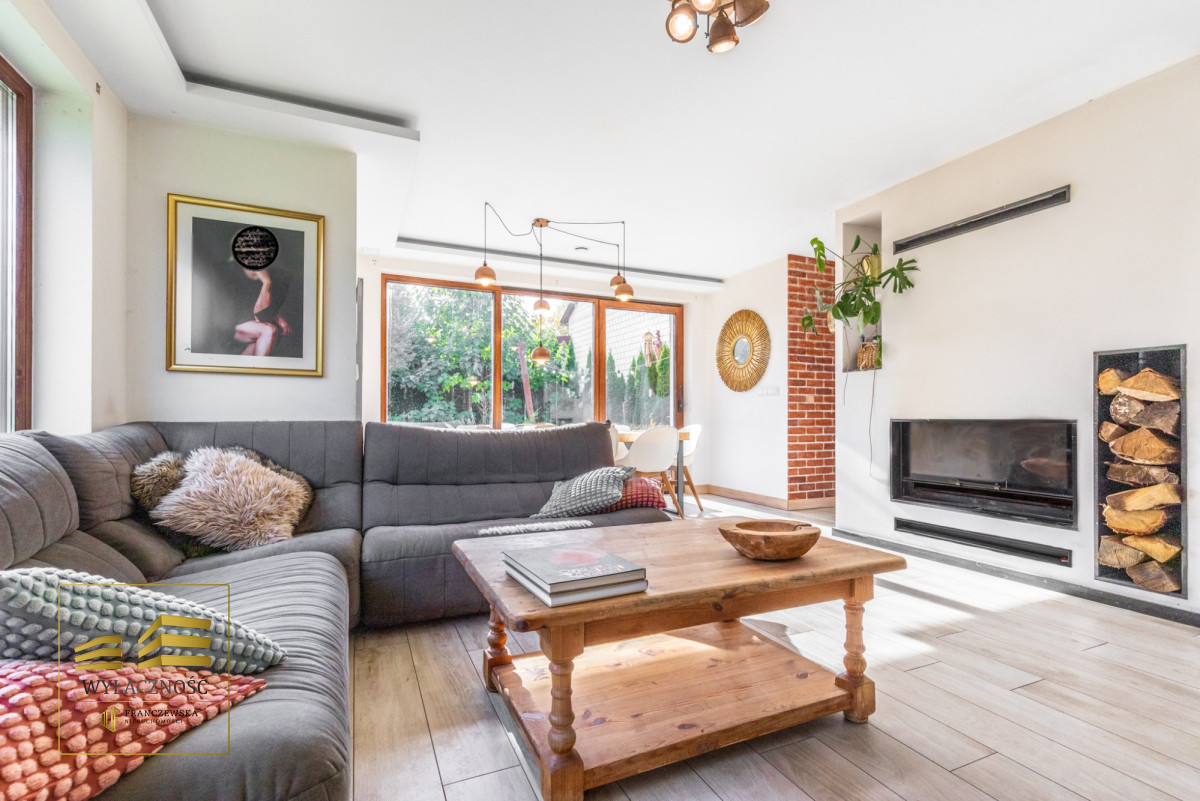 Sercem domu jest salon z tradycyjnym kominkiem i dużymi oknami, z którego roztacza się widok na ogród i zaprasza na taras, by tam delektować się świeżym powietrzem, śpiewem ptaków, słońcem. W części dziennej znajduje się również jadalnia i półotwarta, nowoczesna kuchnia. Na parterze znajdziemy też gabinet, łazienkę z prysznicem, kotłownię i wejście do garażu. Dodatkowym atutem nieruchomości jest pomieszczenie z oddzielnym wejściem, które może być przeznaczone jako pokój dla gości lub pod prowadzenie działalności gospodarczej.