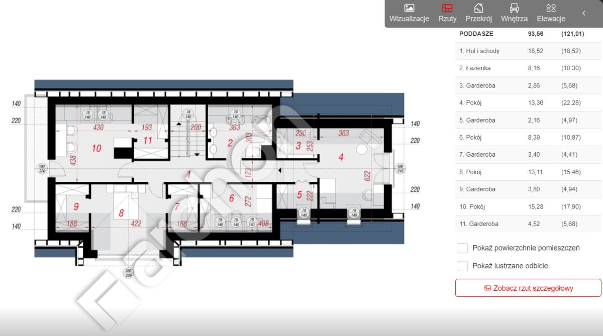 - sypialnia z balkonem i garderobą o łącznej pow. ok.19,80m2; wystawa okien: południe;