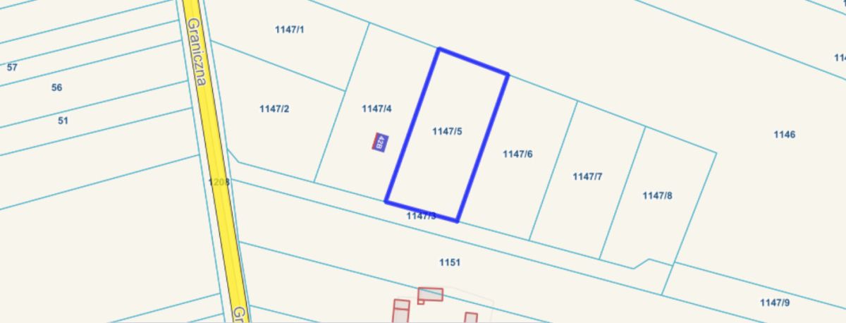 o powierzchni 2251 m2 w trzeciej linii zabudowy o wymiarach 40,9 x 63,1 m. Numer działki 1147/5