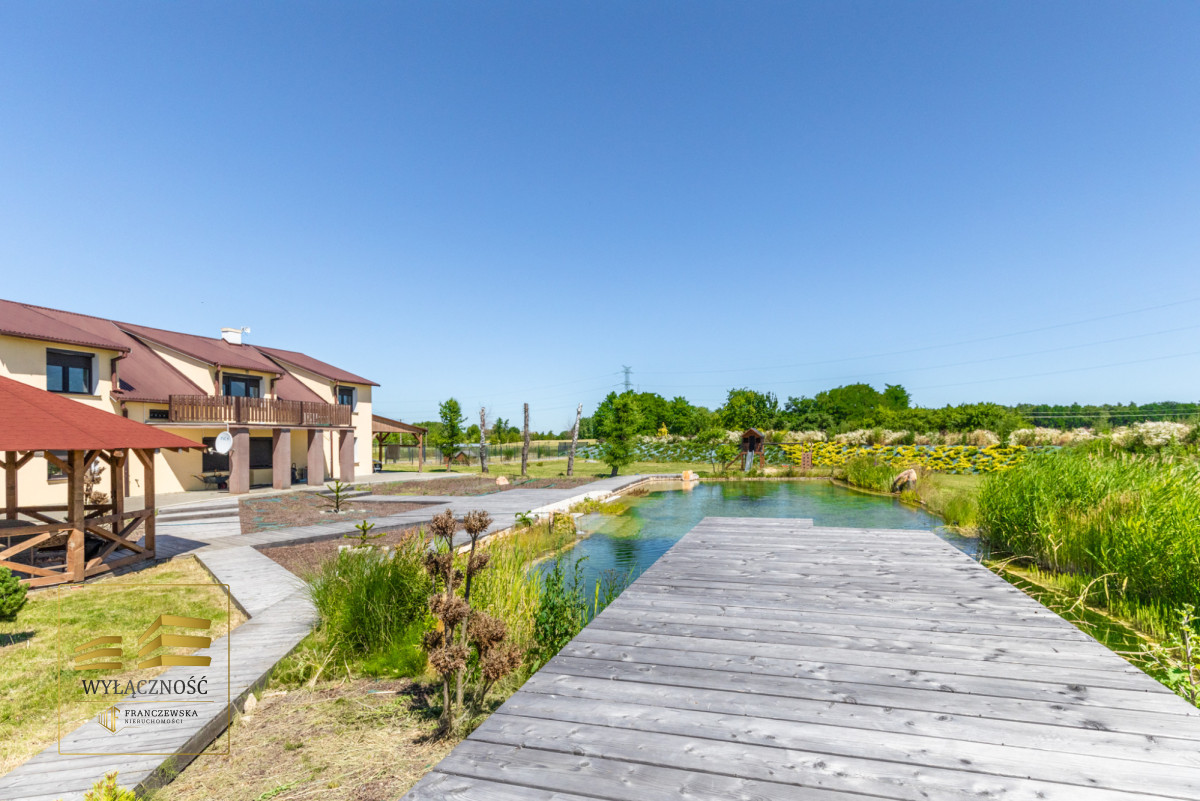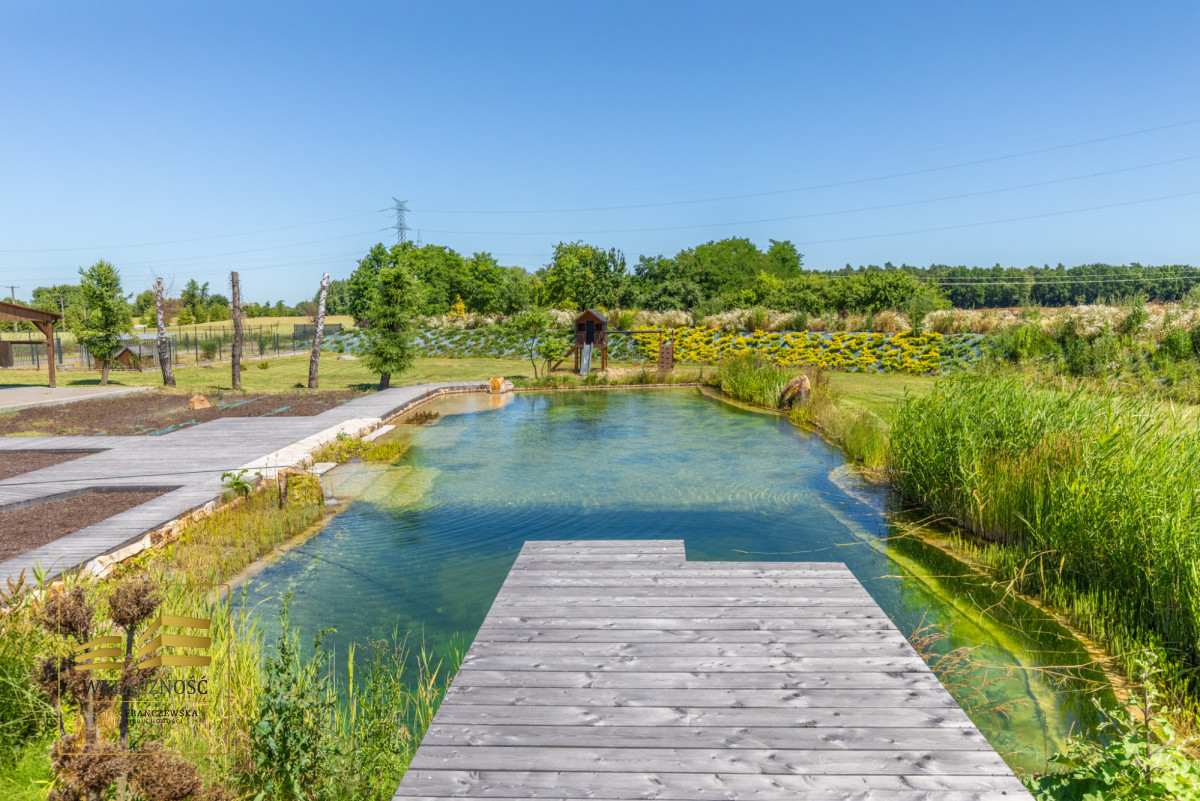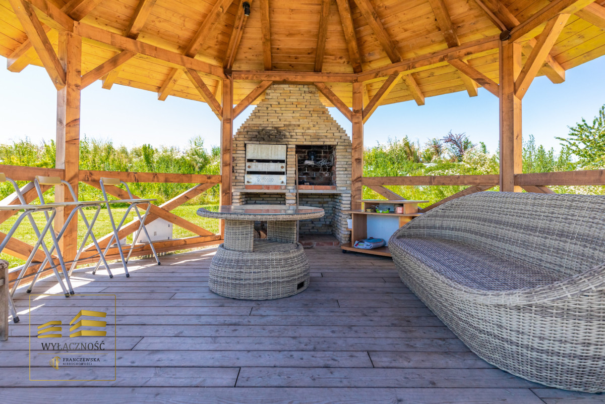 Teren ogrodzony, brama sterowana zdalnie, zagospodarowany ogród z basenem, altana z grillem, taras, wiata garażowa na dwa auta.