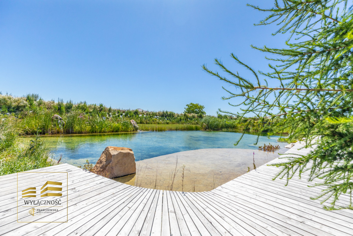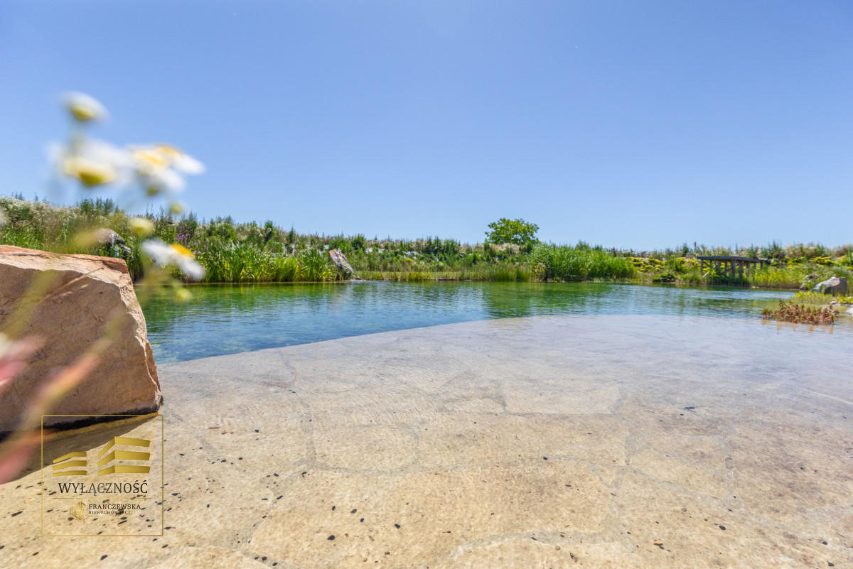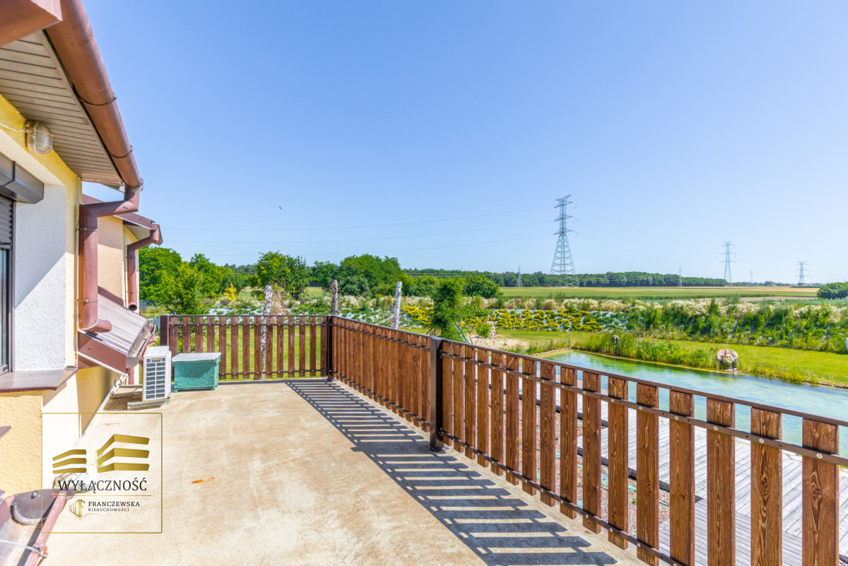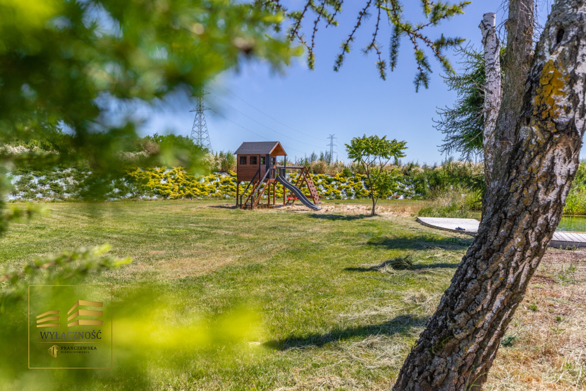 Teren ogrodzony, brama sterowana zdalnie, zagospodarowany ogród z basenem, altana z grillem, taras, wiata garażowa na dwa auta.