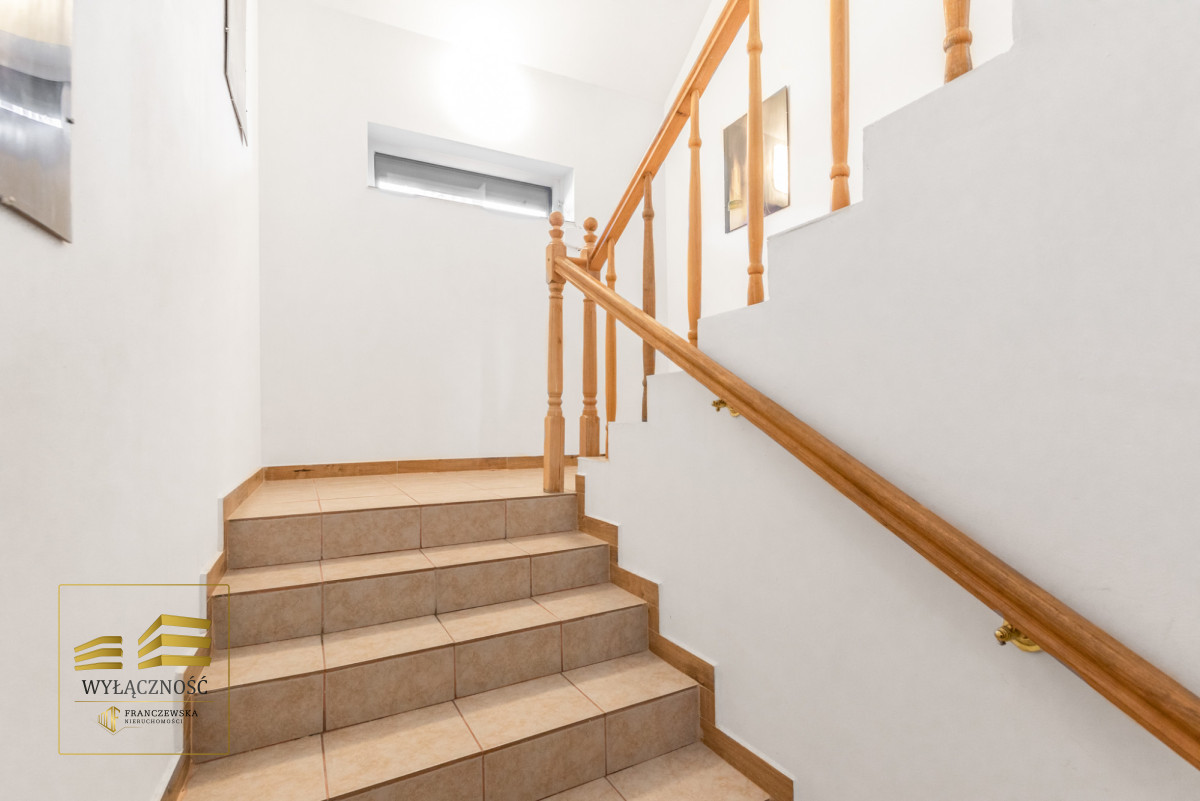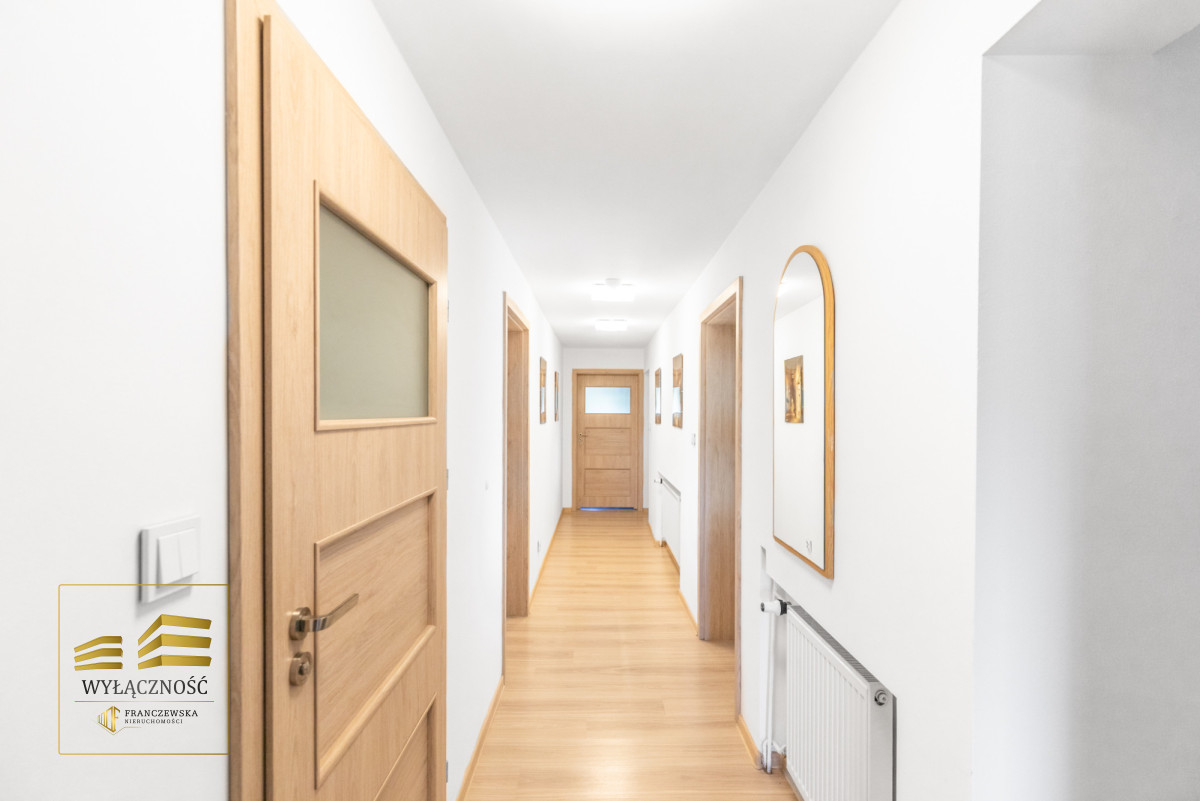 ogrzewanie gazowe, kominek, klimatyzacja, stacja uzdatniania wody, monitoring, wideodomofon, rolety zewnętrzne, szambo.