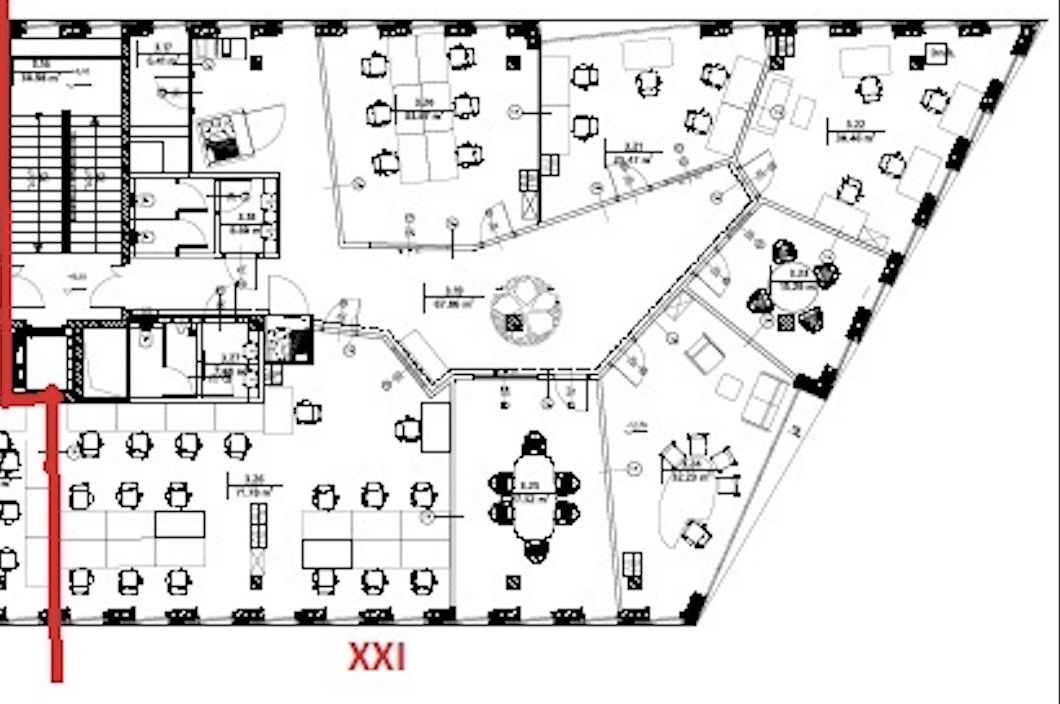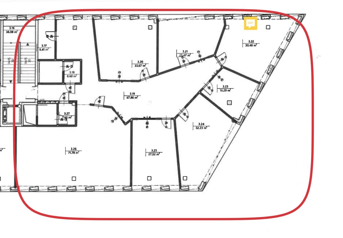 - 4 mniejsze pomieszczenia open space (33 m², 32 m², 30 m², 27 m²).