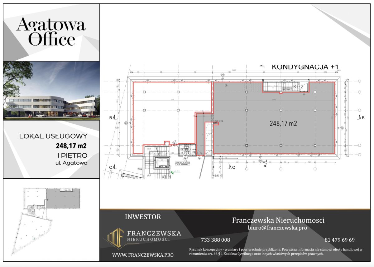 Do wynajęcia unikalny lokal handlowo-usługowy o powierzchni 248,17 m², usytuowany na I piętrze nowoczesnego budynku Agatowa Office przy ul. Agatowej w Lublinie. Lokal z ekspozycją okien na trzy strony świata oferuje wyjątkowy widok na tereny zielone, co zapewnia komfortową i sprzyjającą koncentracji atmosferę pracy. Budynek o minimalistycznym, eleganckim designie łączy funkcjonalność z estetyką, odpowiadając na potrzeby wymagających przedsiębiorców i inwestorów.