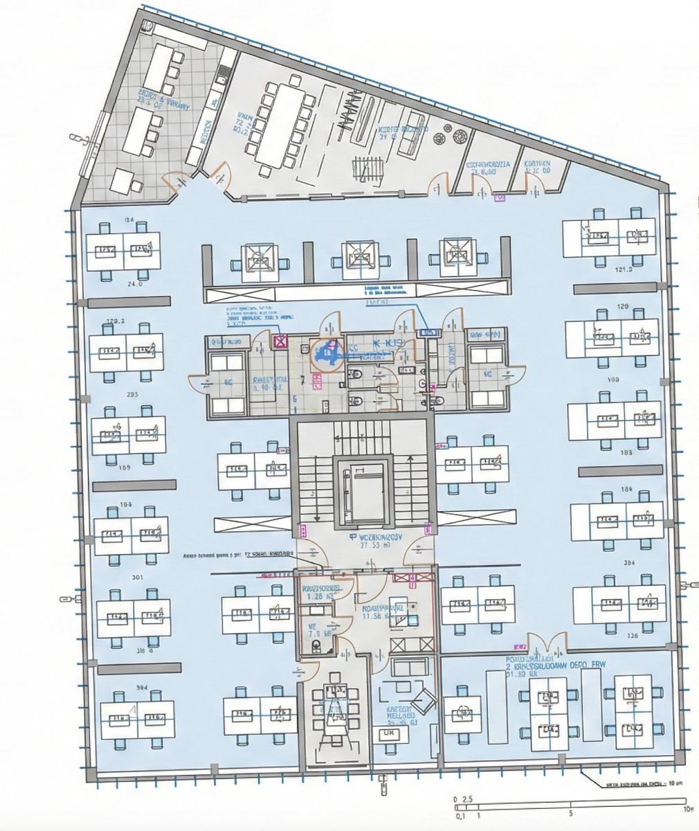 - Maksymalna Efektywność (Mixed-Plan): Układ zaprojektowany dla zespołu 80-90 osób, łączący strefy Open Space z prywatnymi gabinetami i salami konferencyjnymi.