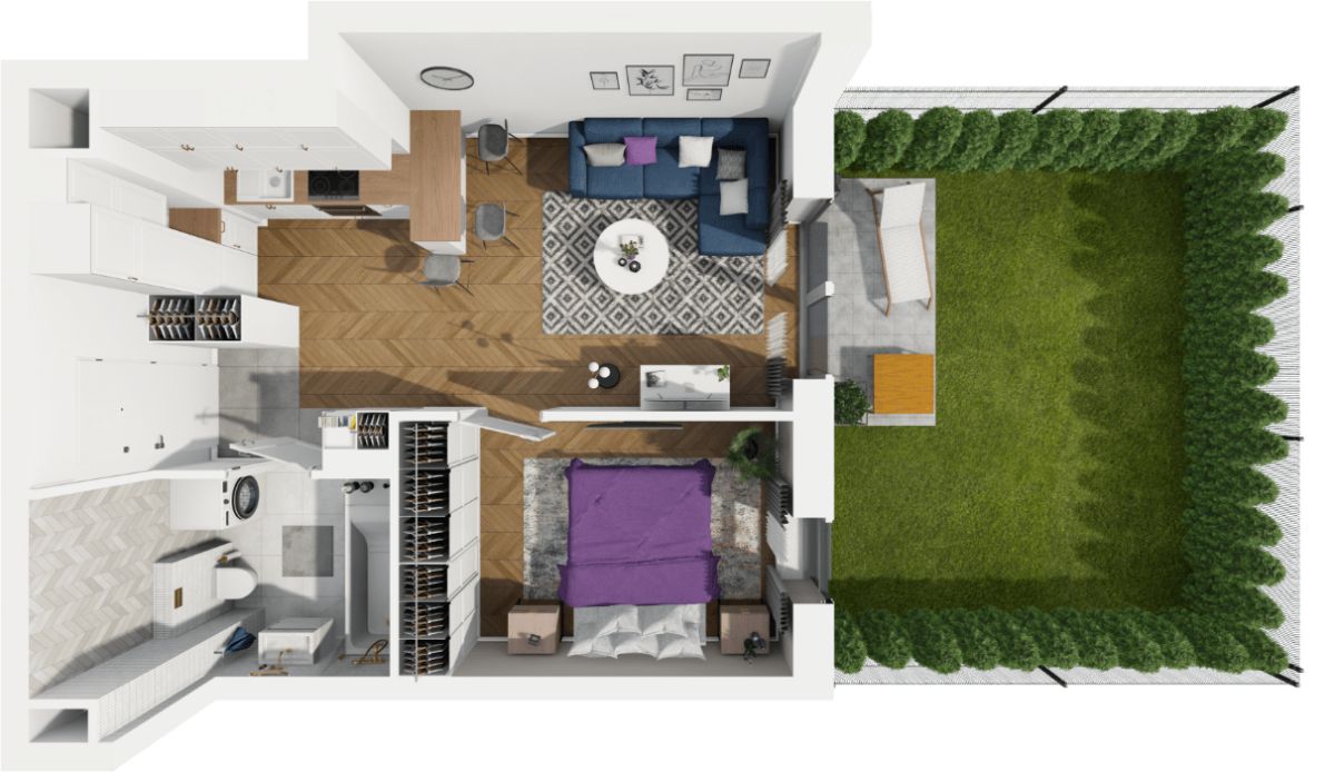 -Pokój dzienny z aneksem kuchennym o pow. 18,84 m2 z wyjściem do ogródka