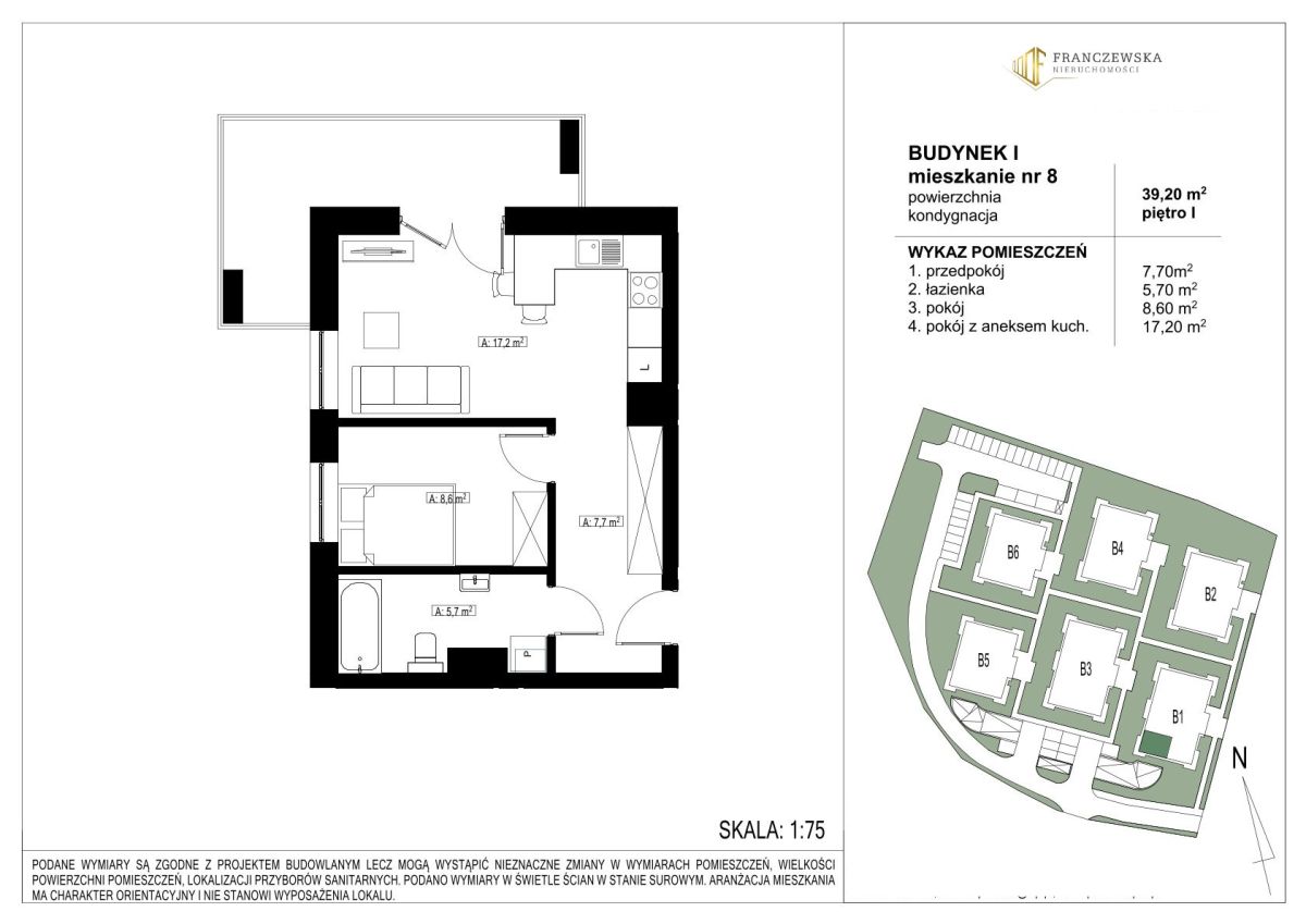 Dwupokojowe mieszkanie o powierzchni 39,20 m2 na 1 piętrze w 3 piętrowym bloku.