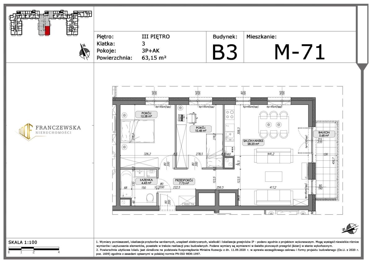 Trzypokojowe mieszkanie o powierzchni projektowej 63,15m2 położone na drugim piętrze w budynku z wystawą okien na południe i wschód.