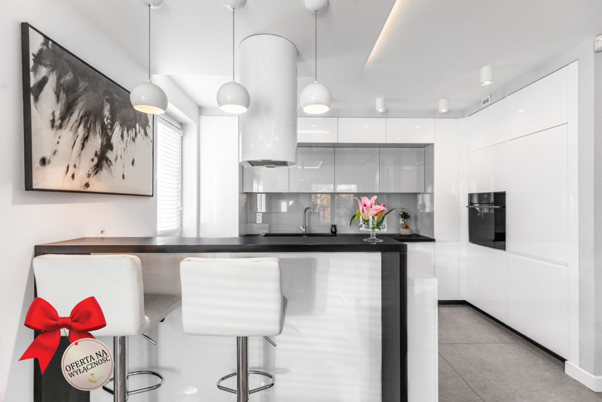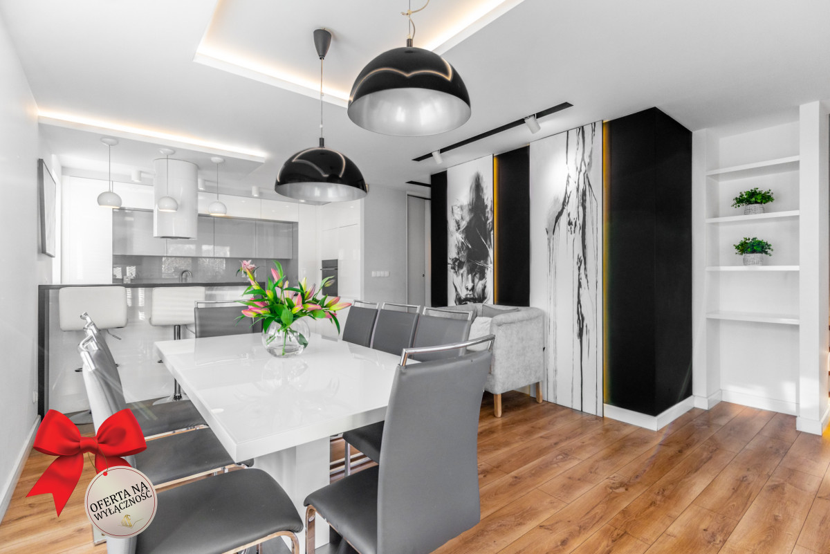 • elegancki pokój dzienny z gustowną kuchnią i wyjściem na balkon