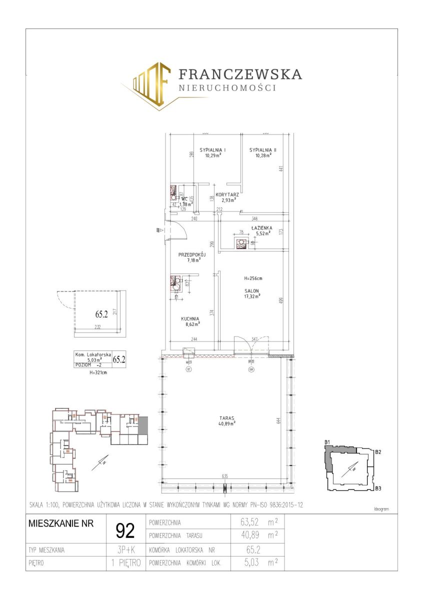Trzypokojowe mieszkanie o powierzchni projektowej 63,23 m2 z wystawą okien na północny-zachód i południowy-wschód