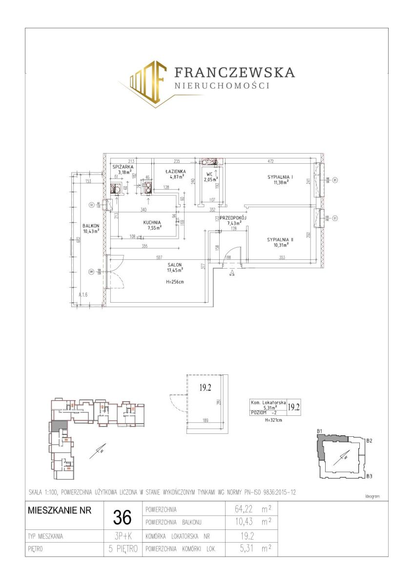 Trzypokojowe mieszkanie o powierzchni projektowej 64,22 m2 z wystawą okien na północny-wschód i południowy-zachód.