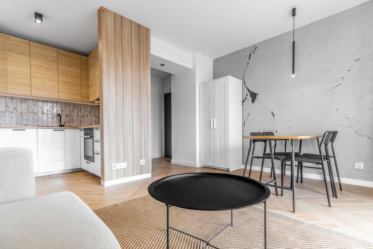Salon z aneksem kuchennym z wyjściem na balkon