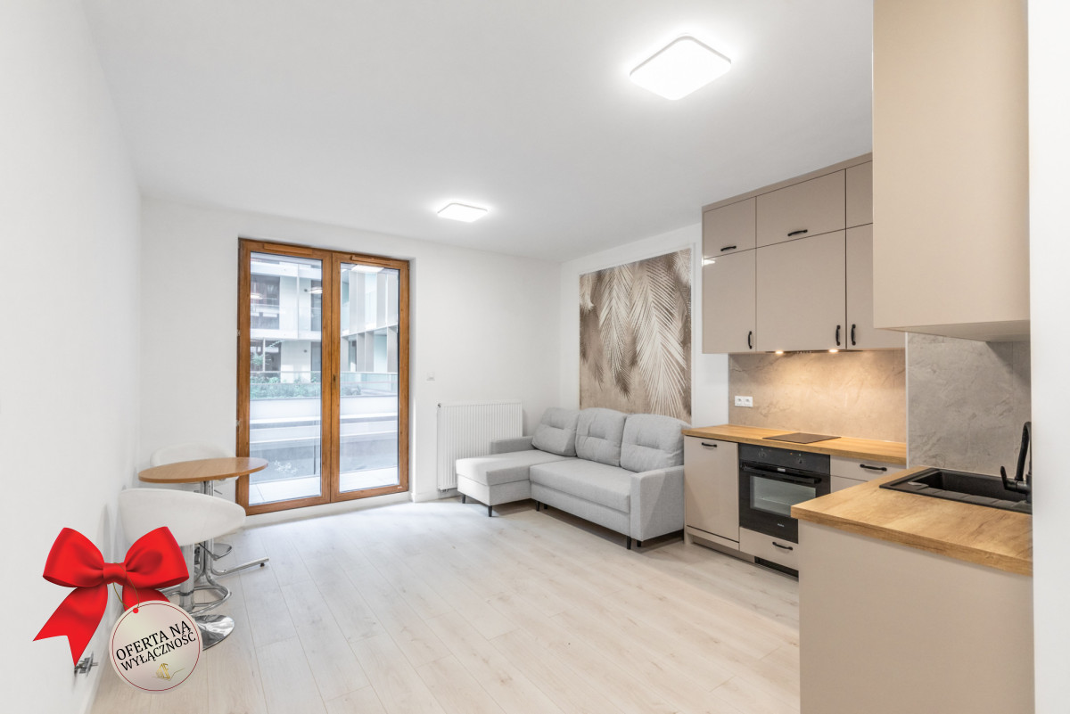 Kuchnia w pełni wyposażona: zmywarka, lodówka, płyta indukcyjna, okap, piekarnik.