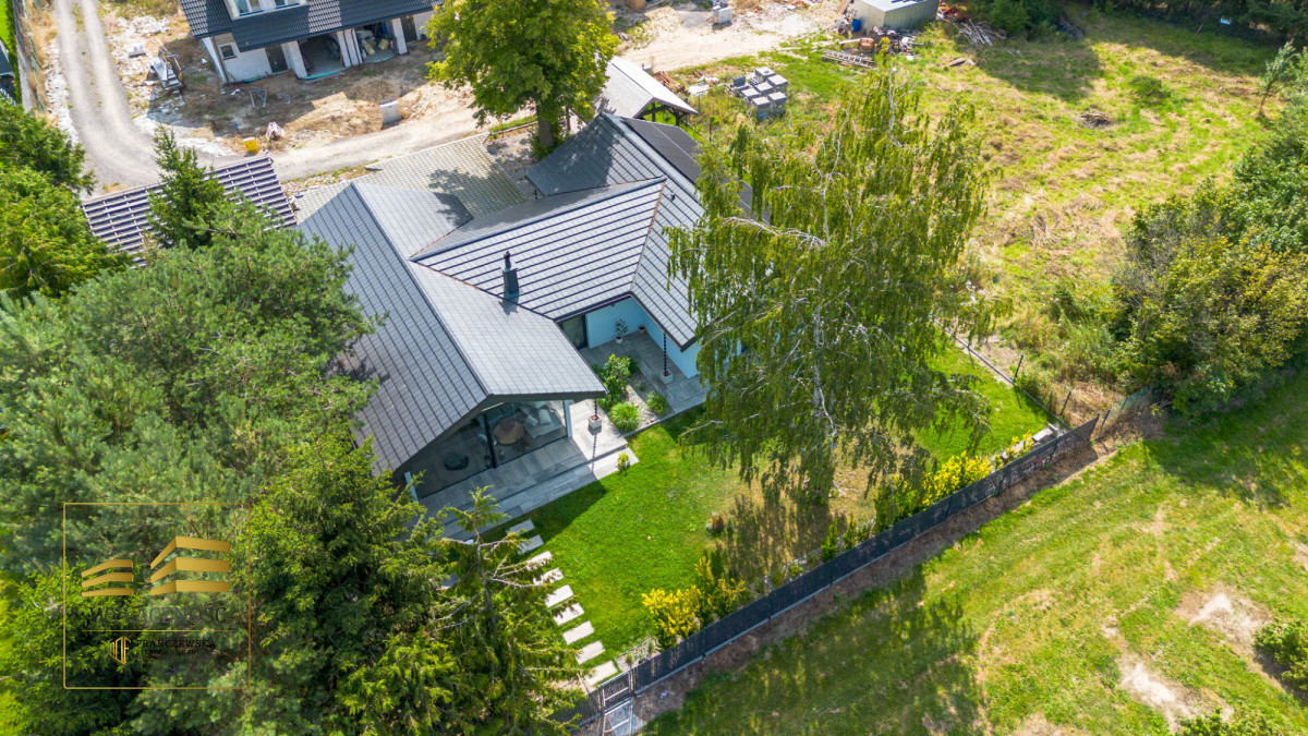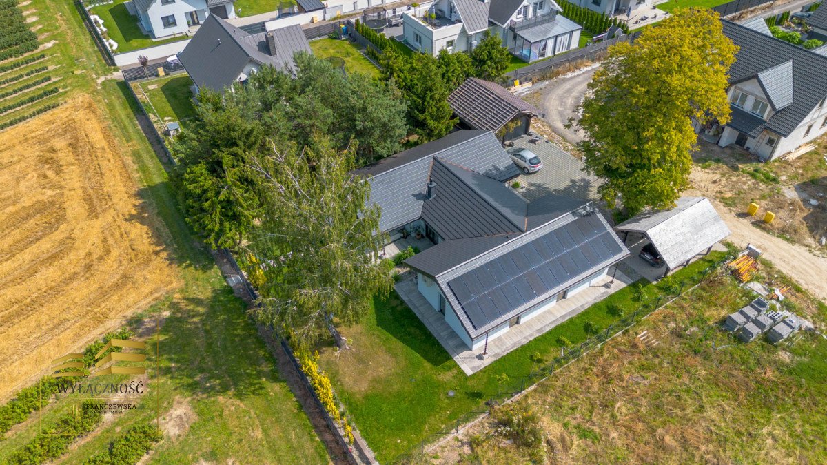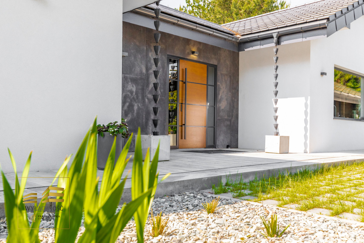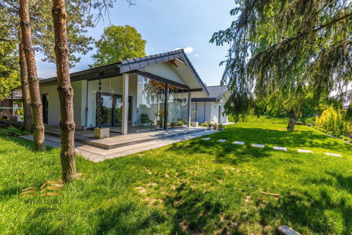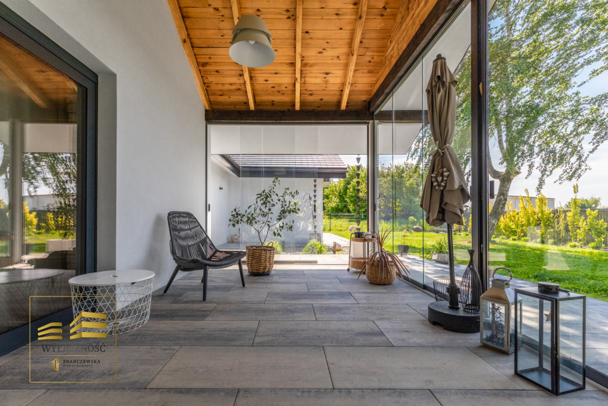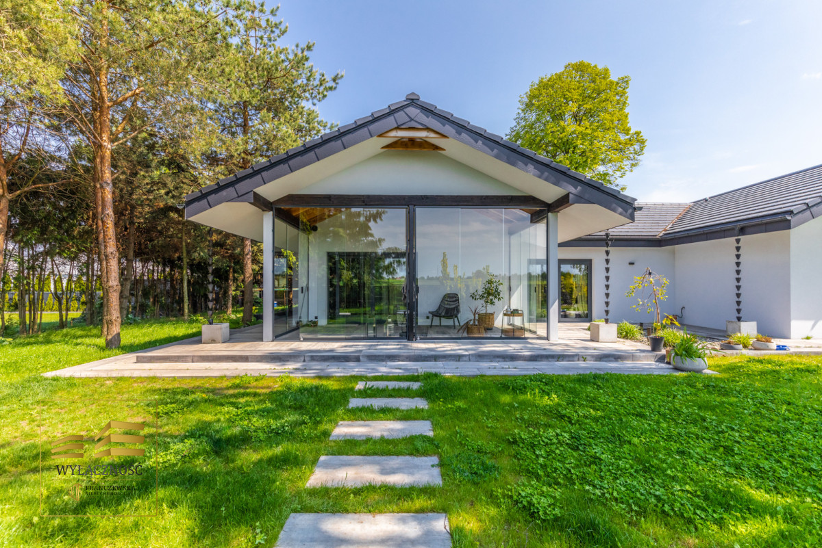 Wnętrze domu charakteryzuje się imponującą wysokością pomieszczeń (3,60 m), dużą ilością naturalnego światła oraz przemyślaną aranżacją. Z każdego pokoju można bezpośrednio wyjść do ogrodu, a całoroczny ogród zimowy stanowi wyjątkową przestrzeń do relaksu. Budynek został oddany do użytkowania w 2025 roku i wykonany z wysokiej jakości materiałów, takich jak dębowa podłoga firmy Chapel. Na terenie posesji znajduje się również garaż z zapleczem spiżarnym.