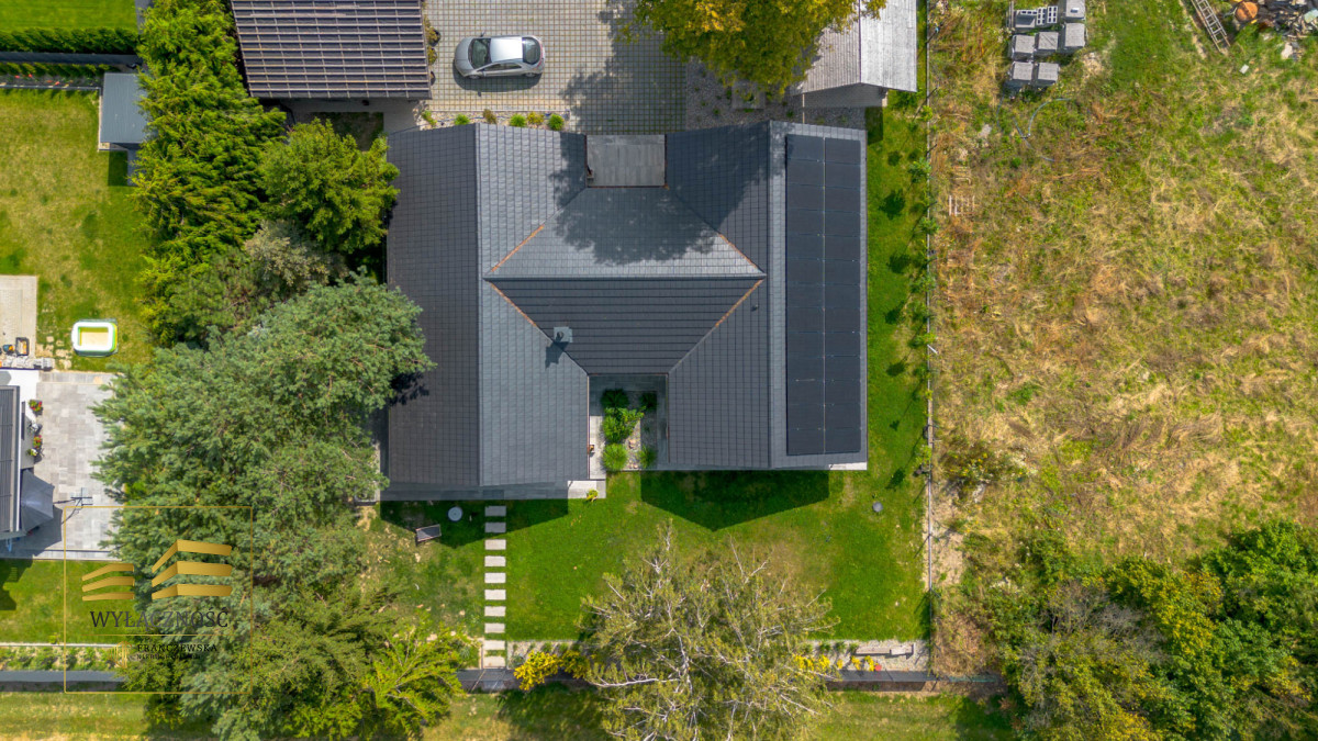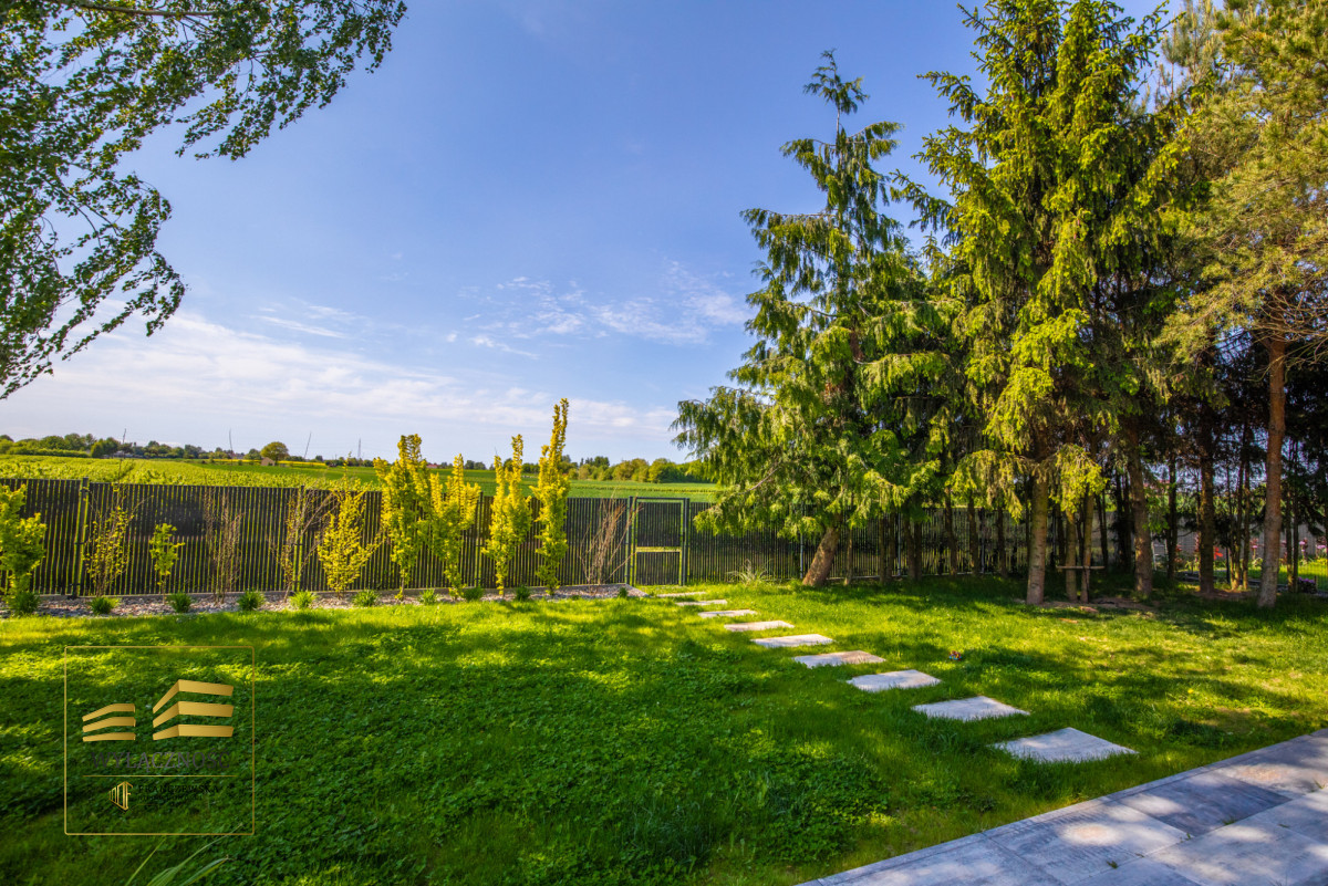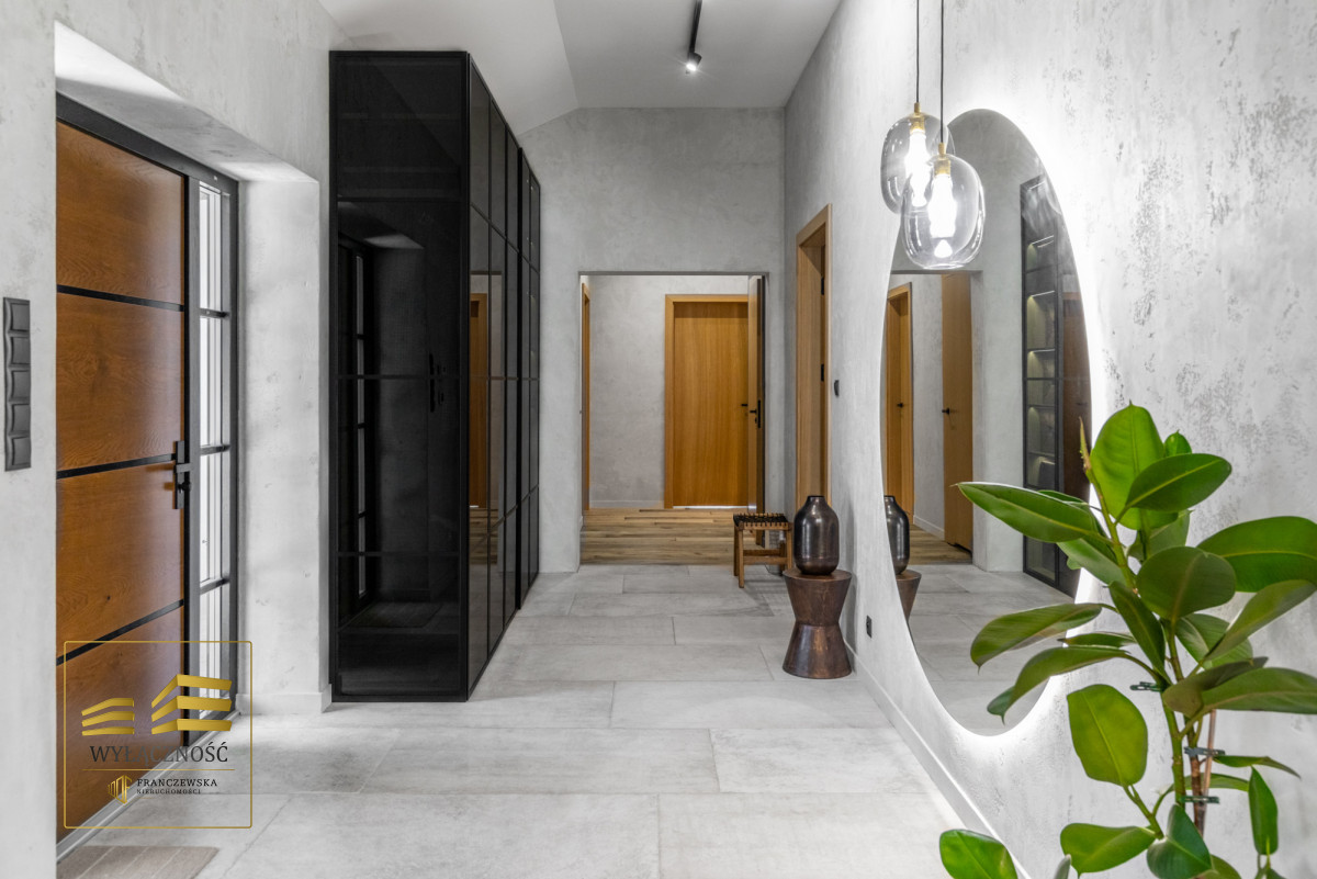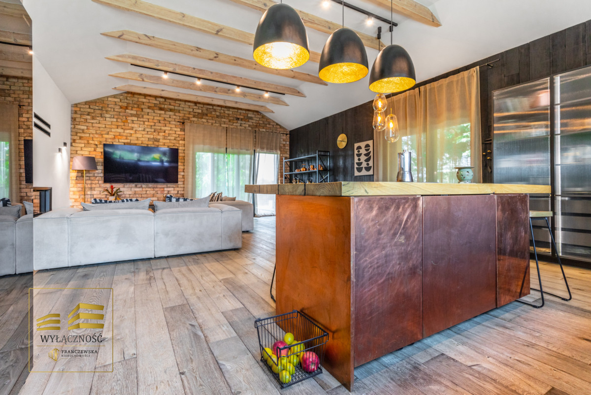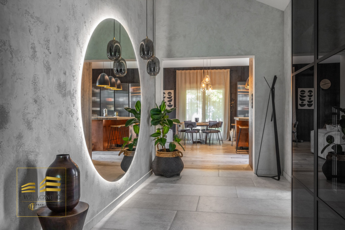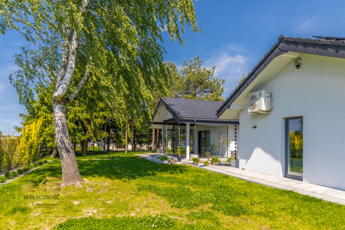 Wnętrze domu charakteryzuje się imponującą wysokością pomieszczeń (3,60 m), dużą ilością naturalnego światła oraz przemyślaną aranżacją. Z każdego pokoju można bezpośrednio wyjść do ogrodu, a całoroczny ogród zimowy stanowi wyjątkową przestrzeń do relaksu. Budynek został oddany do użytkowania w 2025 roku i wykonany z wysokiej jakości materiałów, takich jak dębowa podłoga firmy Chapel. Na terenie posesji znajduje się również garaż z zapleczem spiżarnym.