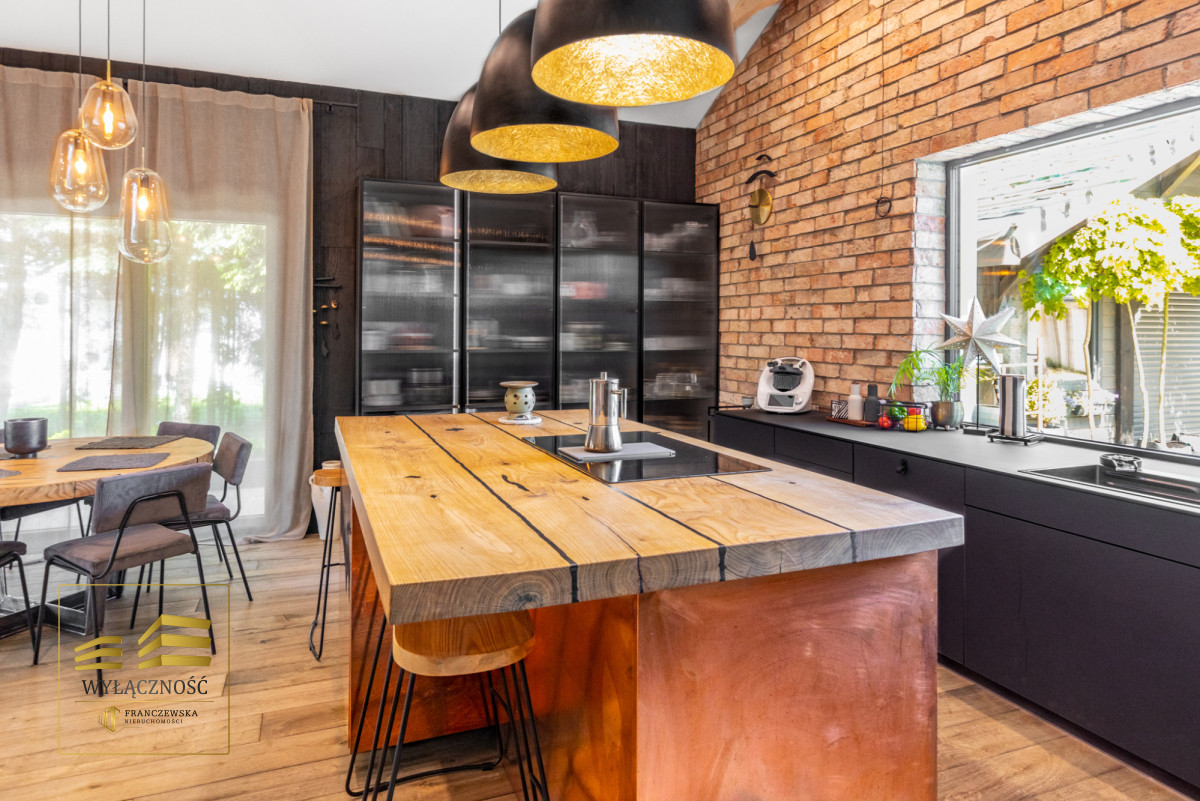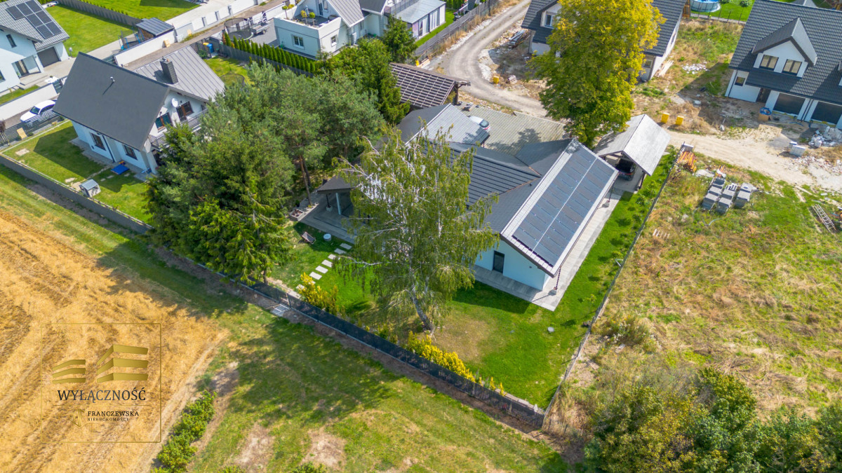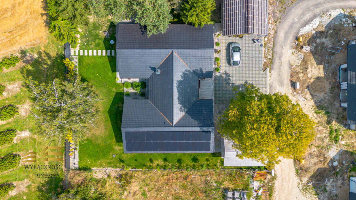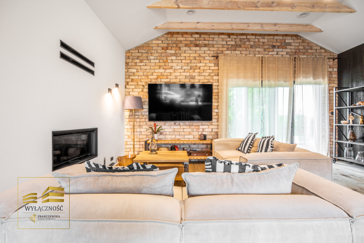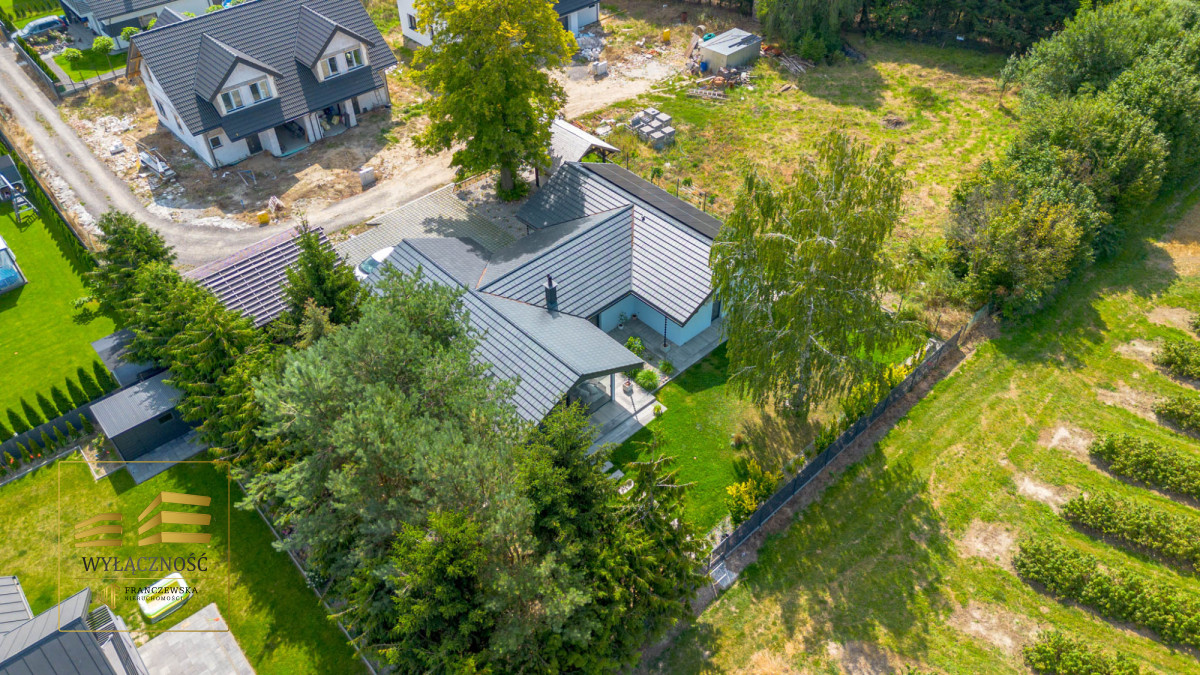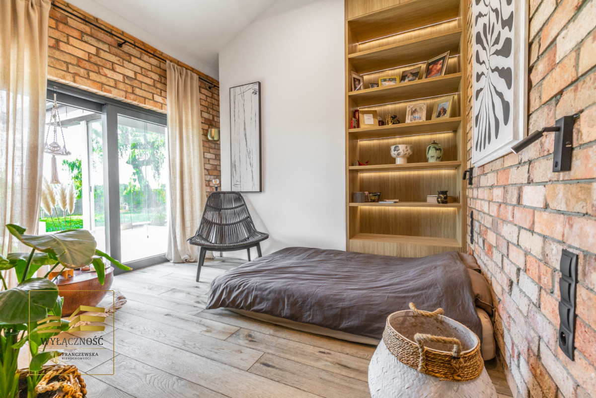 Wnętrze domu charakteryzuje się imponującą wysokością pomieszczeń (3,60 m), dużą ilością naturalnego światła oraz przemyślaną aranżacją. Z każdego pokoju można bezpośrednio wyjść do ogrodu, a całoroczny ogród zimowy stanowi wyjątkową przestrzeń do relaksu. Budynek został oddany do użytkowania w 2025 roku i wykonany z wysokiej jakości materiałów, takich jak dębowa podłoga firmy Chapel. Na terenie posesji znajduje się również garaż z zapleczem spiżarnym.