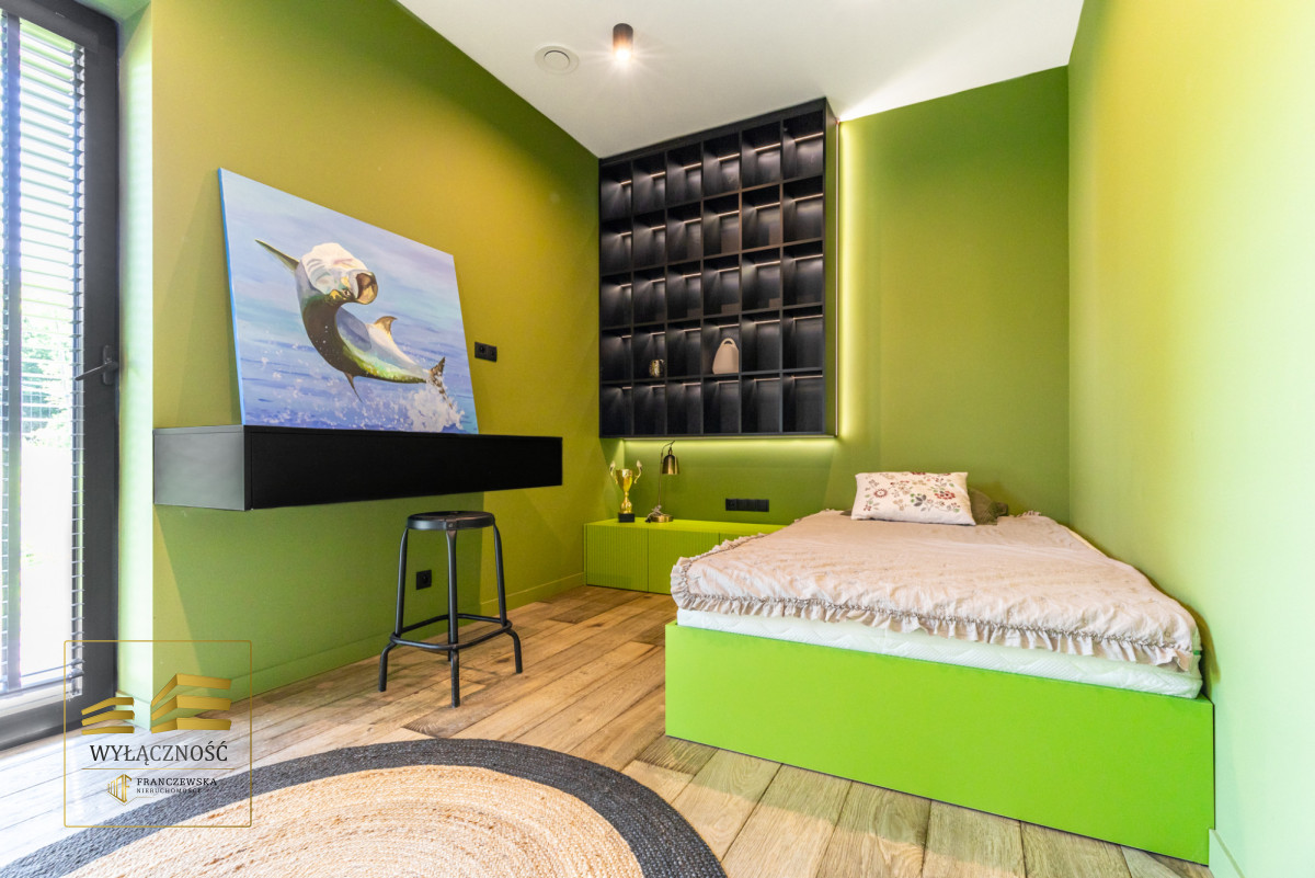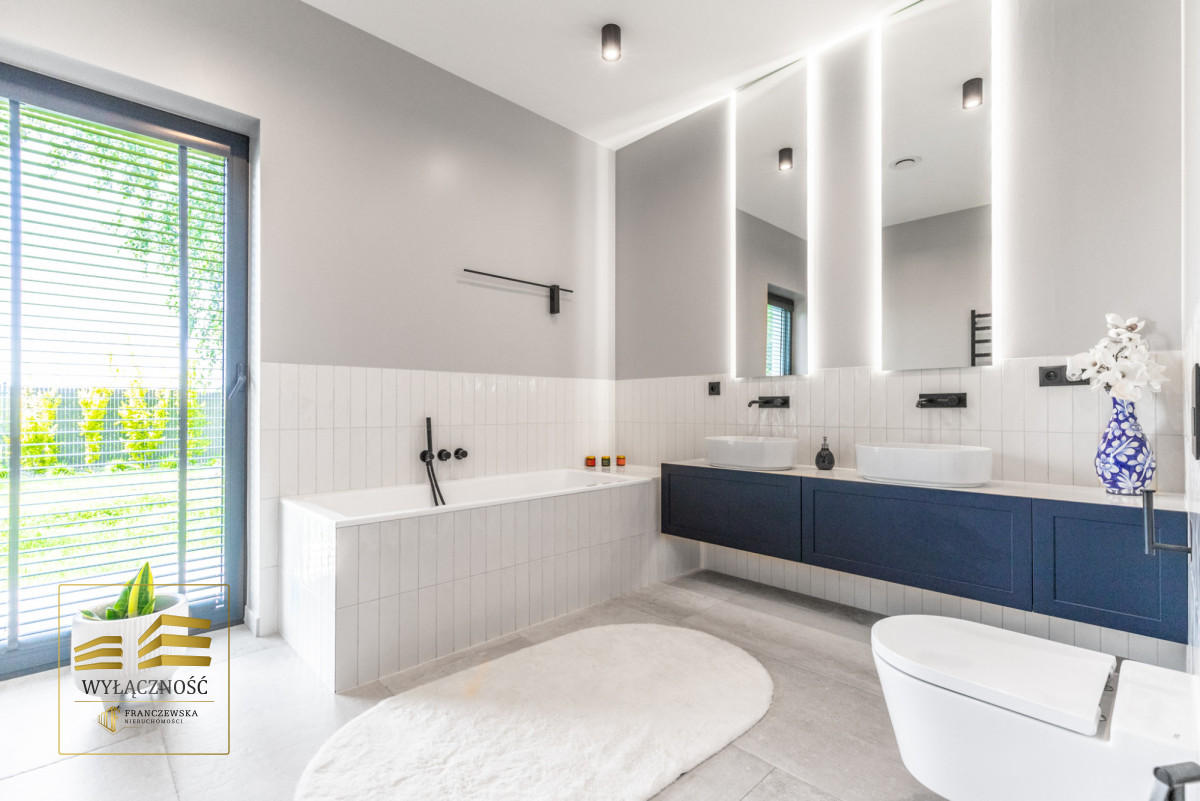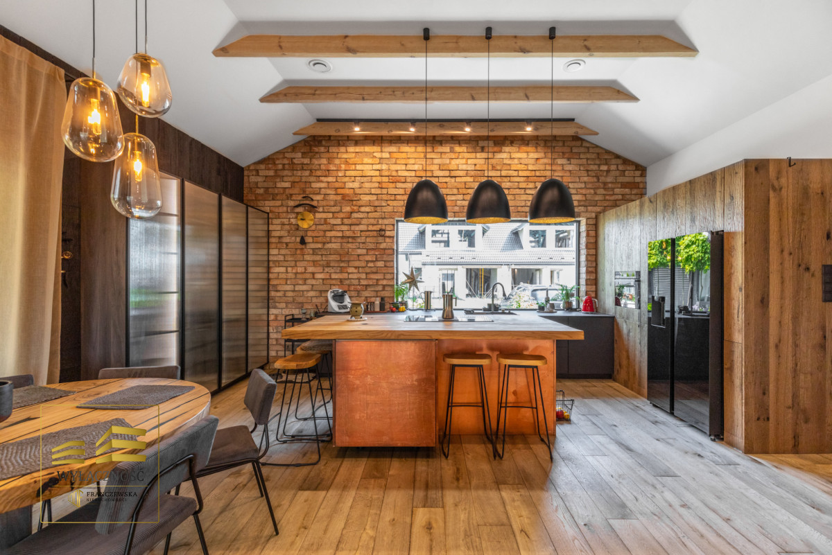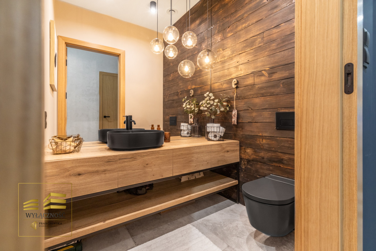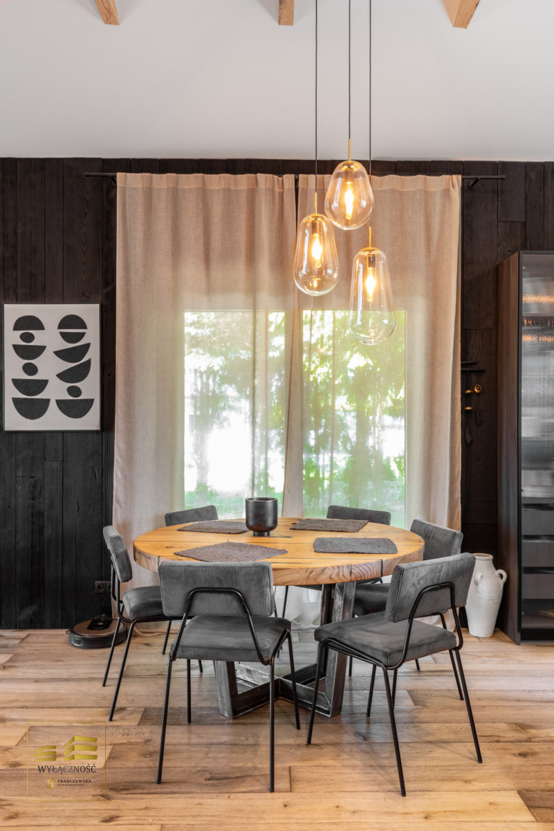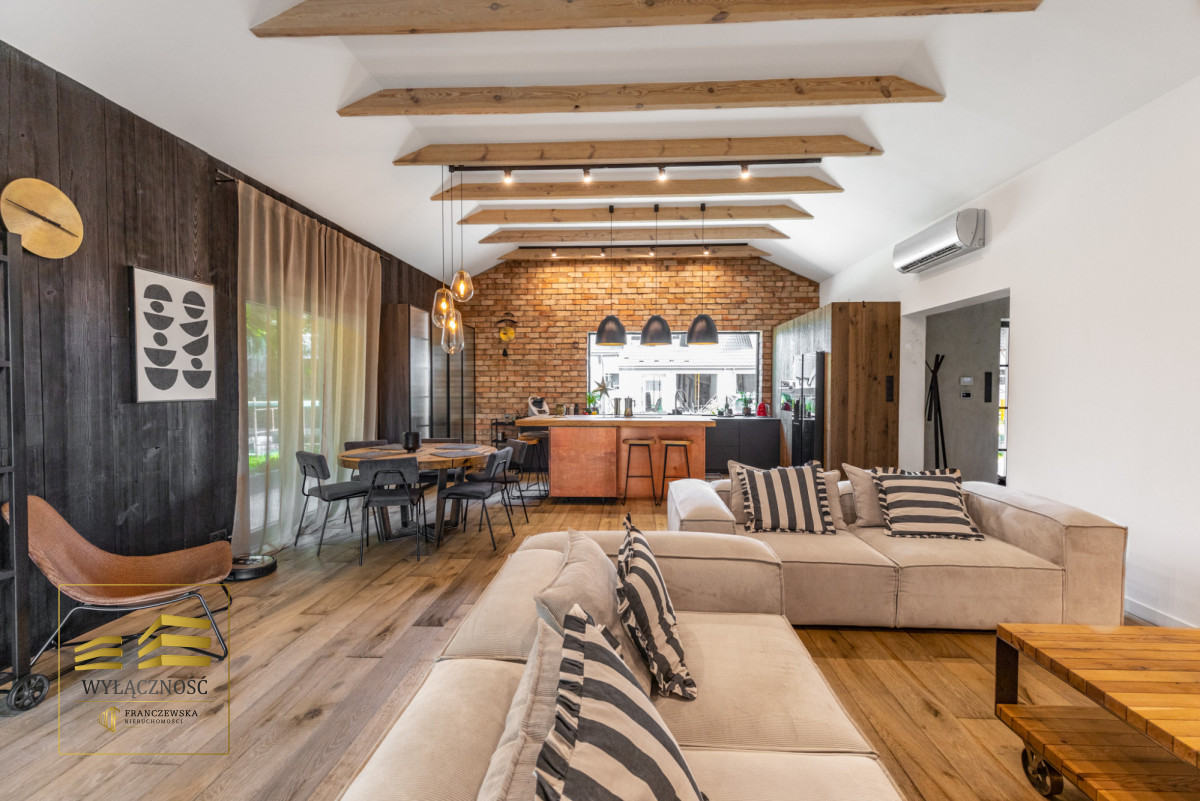 Wnętrze domu charakteryzuje się imponującą wysokością pomieszczeń (3,60 m), dużą ilością naturalnego światła oraz przemyślaną aranżacją. Z każdego pokoju można bezpośrednio wyjść do ogrodu, a całoroczny ogród zimowy stanowi wyjątkową przestrzeń do relaksu. Budynek został oddany do użytkowania w 2025 roku i wykonany z wysokiej jakości materiałów, takich jak dębowa podłoga firmy Chapel. Na terenie posesji znajduje się również garaż z zapleczem spiżarnym.