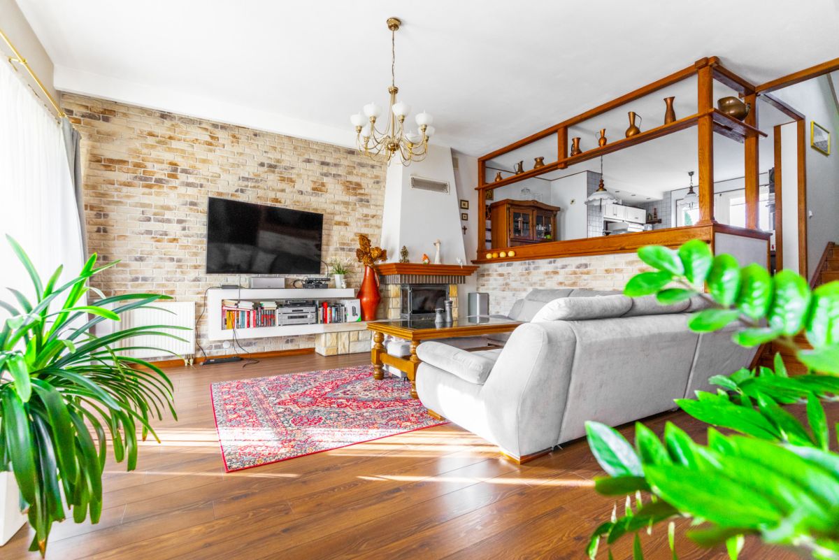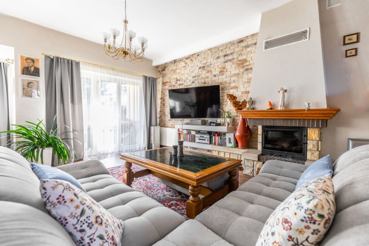 - salon z kominkiem o pow. 32,7 m2 z wyjściem na taras od południowej strony.