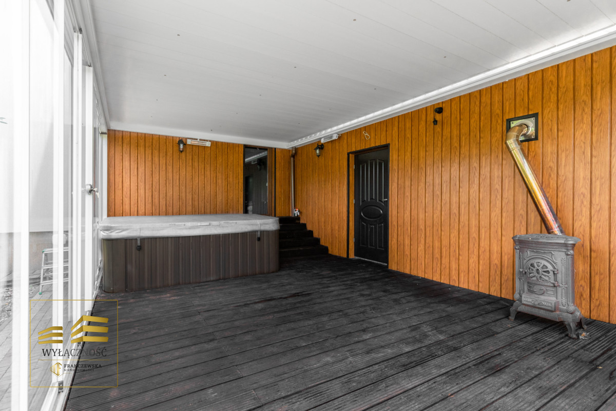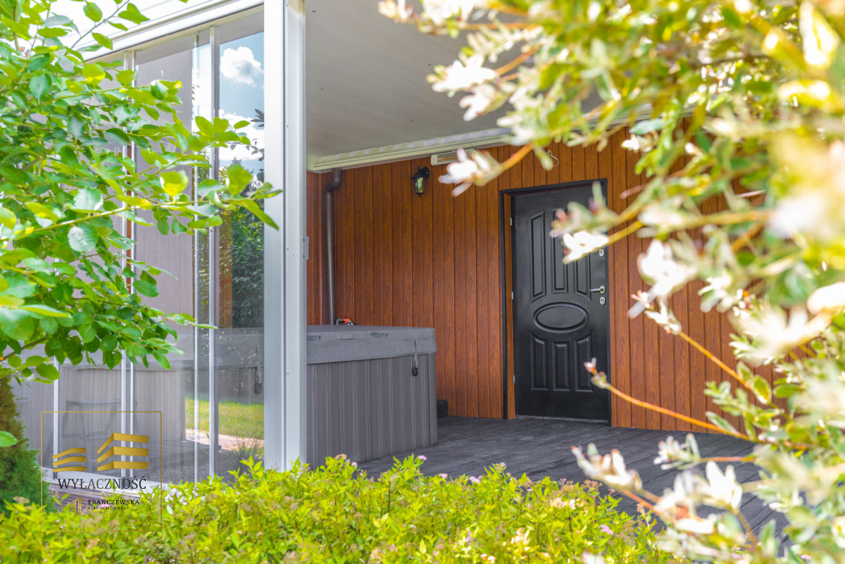 - łazienka z wc o pow. 5,73m2 (prysznic) z wyjściem na zadaszony taras z jacuzzi (tarasola, szyby przesuwne, jacuzzi, koza),