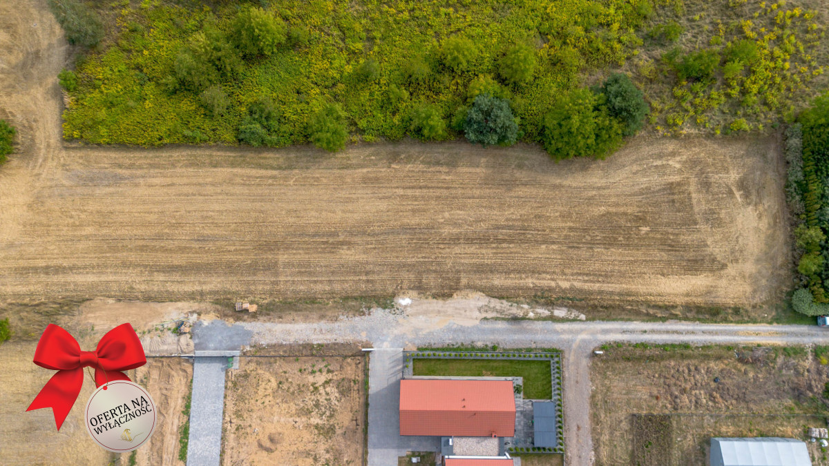 Wymiary działki 75,50m x 26m, pierwsza linia zabudowy przy drodze utwardzonej.