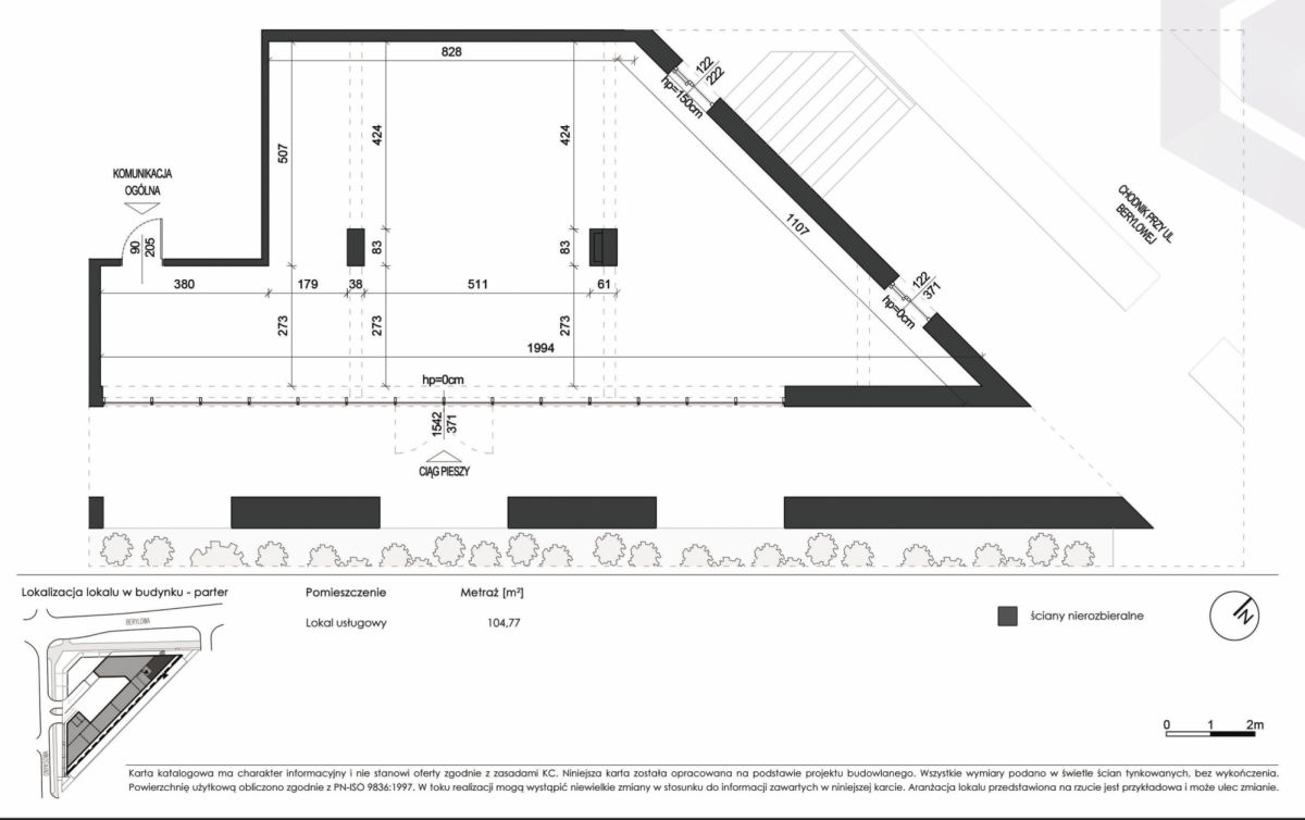 Lokal typu open space o powierzchni 105 m² (dokładnie 104,77 m² według rzutu) oferuje elastyczną przestrzeń.
