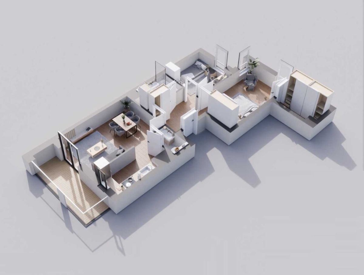 Dwustronne, trzypokojowe mieszkanie o powierzchni projektowej 67,34 m2 z wystawą okien na północny-wschód i południowy-zachód.